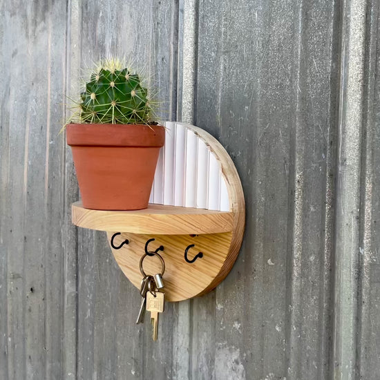 Keep your entryway neat and inviting with this handcrafted round wall-mounted key holder and shelf. Blending boho elegance with farmhouse warmth, it’s a functional accent piece that elevates any home.